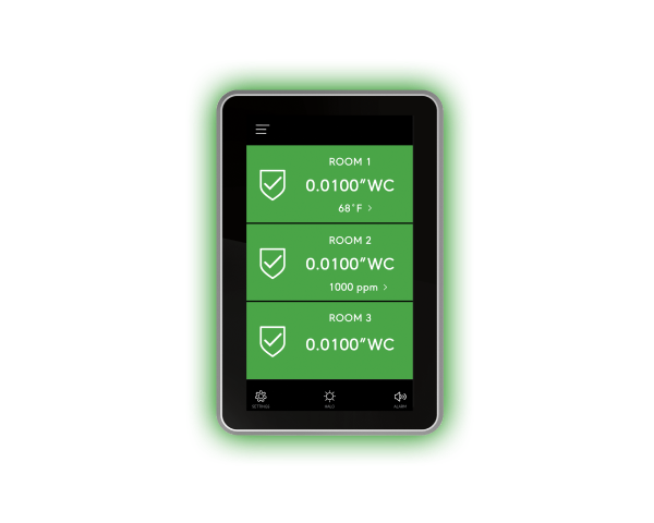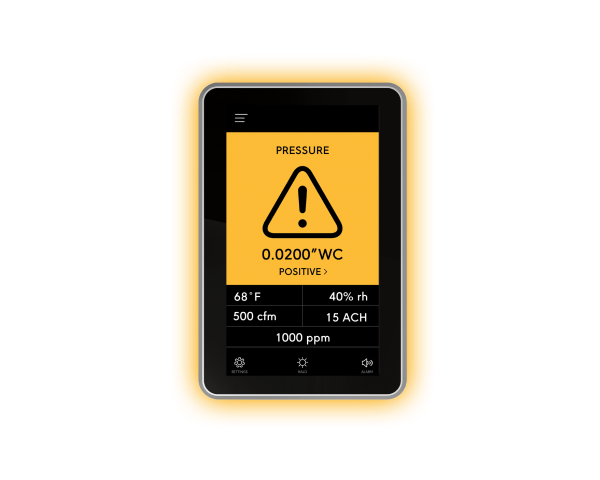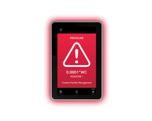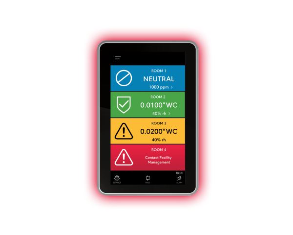 - Capable of displaying pressure, temperature, humidity, air flow, air changes and CO₂ levels across 4 spaces; will alarm only for differential pressure